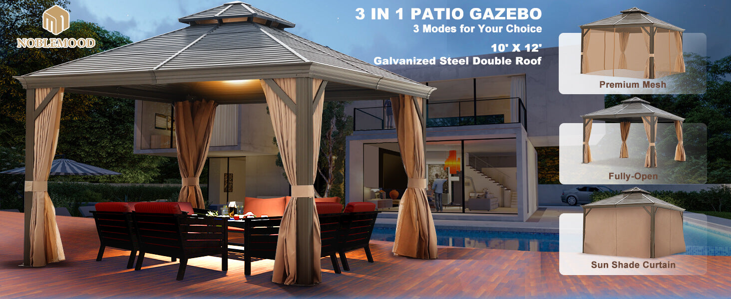 【SPACIOUS SPACE】12x12 gazebo with 144 sq. ft. coverage provides ample space for patio sofa or dining set. NOBLEMOOD offers a wide range of outdoor gazebos in various sizes, styles, and materials, you can choose it depending on your need of courtyards, backyard, swimming pool.