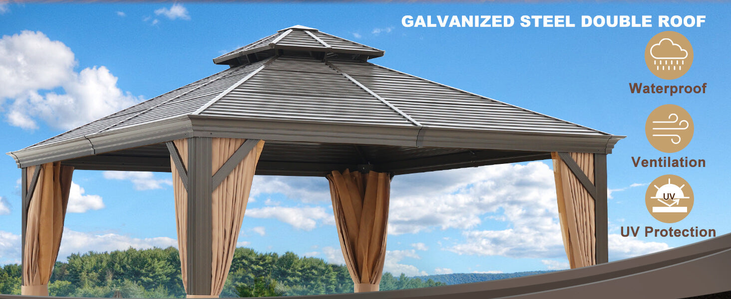 【GALVANIZED STEEL DOUBLE ROOF】The fade-resistant & rust-resistant galvanized steel roof keeps out bright light and 99% harmful UV rays, making the metal hardtop gazebo strong enough to withhold heavy snow & wind. The ventilated double top facilitates ventilation, cooling and slowing down the wind speed.