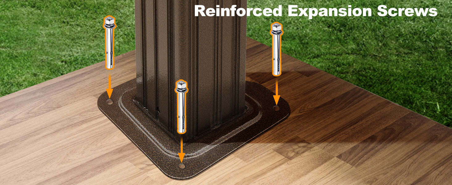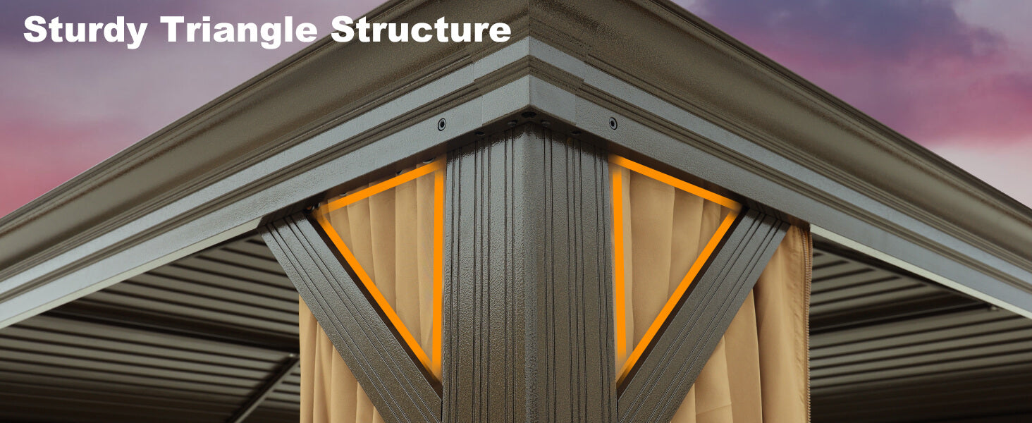 【RUSTPROOF ALUMINUM FRAME】Permanent patio gazebo with 4.72"x4.72" triangular powder-coated aluminum frame is more stable & durable. The gazebo with pre-drilled bases is designed various outdoor situation. All material are built to last, rustproof & weather-resistant.