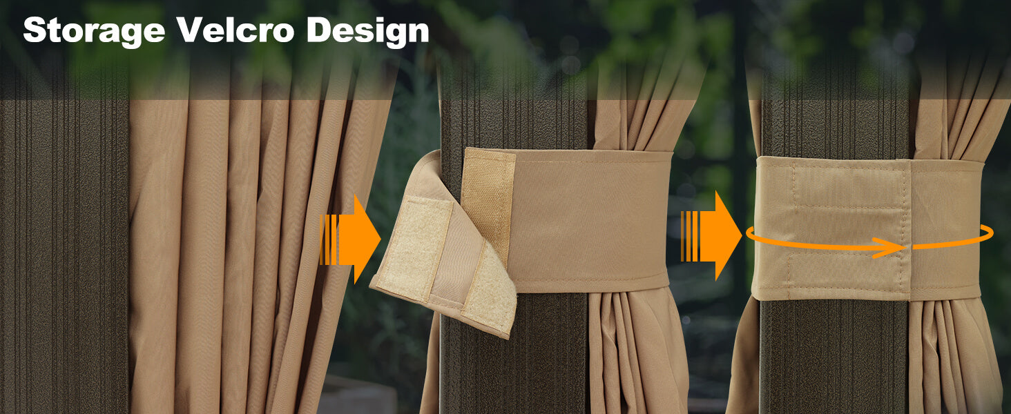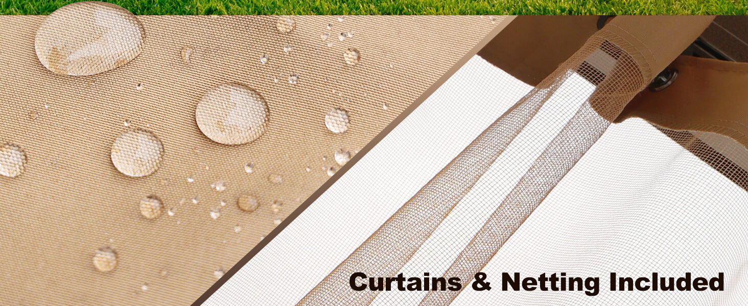 【PRIVACY PROTECTION】Fully enclosed zippered removable double-layer PBV-coated curtains and netting(with ties) protect you from UV rays while adding more privacy. The hooks on the top roof for hanging lights or fans. Gazebo with double track system allows you to slide curtains or nettings easily.