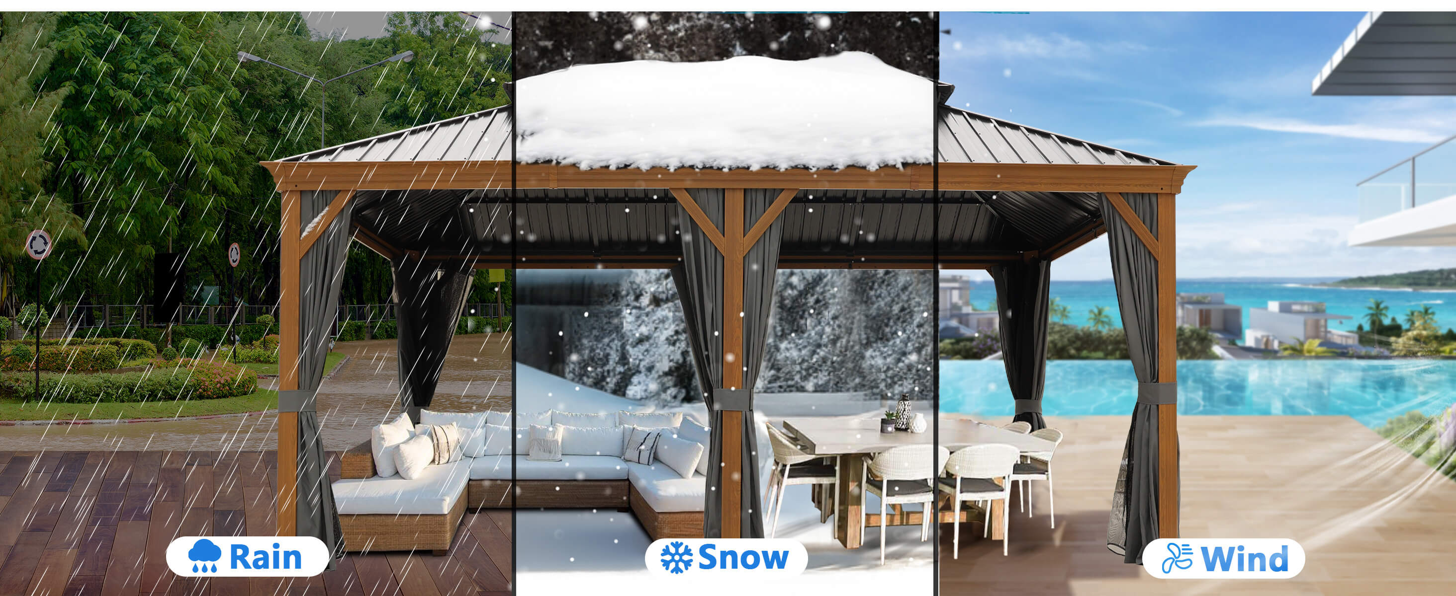 In order to better protect your pavilion, please clear it when the snow thickness exceeds 4 inches. When the wind speed reaches 40mph, please take measures to avoid the wind.