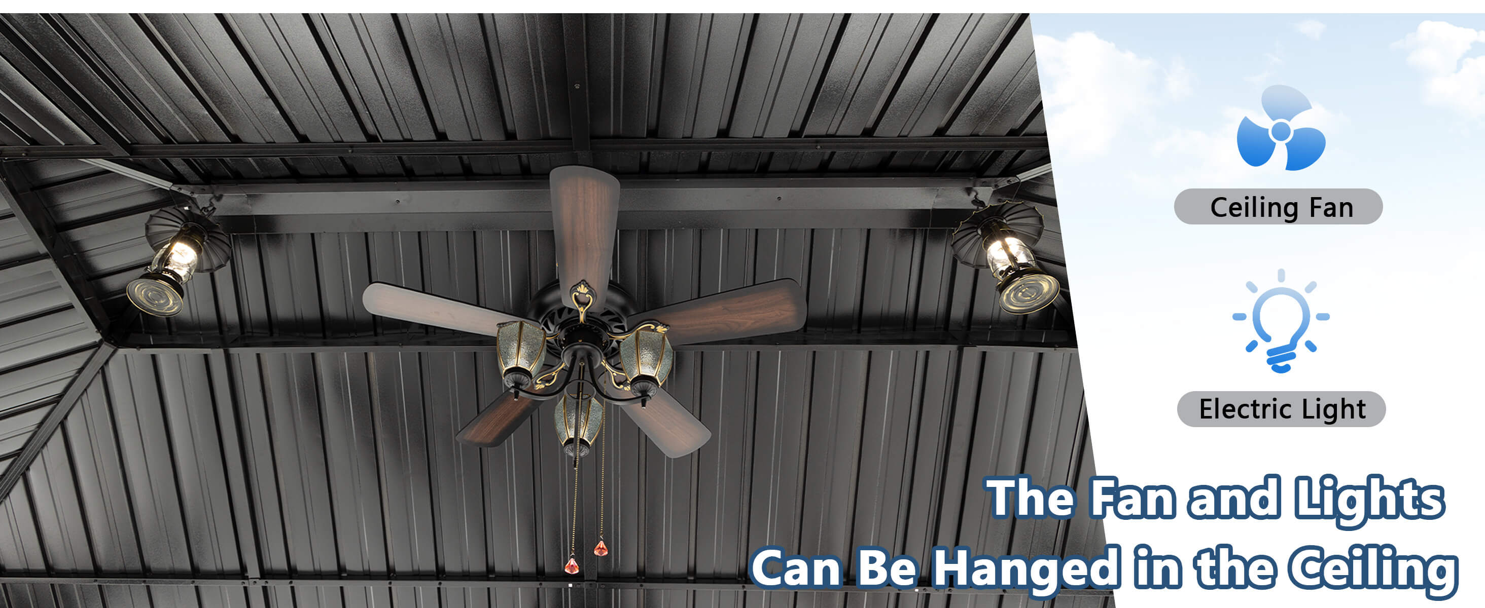 【GALVANIZED STEEL DOUBLE ROOF】The fade-resistant & rust-resistant galvanized steel roof keeps out bright light and 99% harmful UV rays, making the metal hardtop gazebo strong enough to withhold heavy snow & wind. The ventilated double top design facilitates ventilation, cooling and slowing down the wind speed.