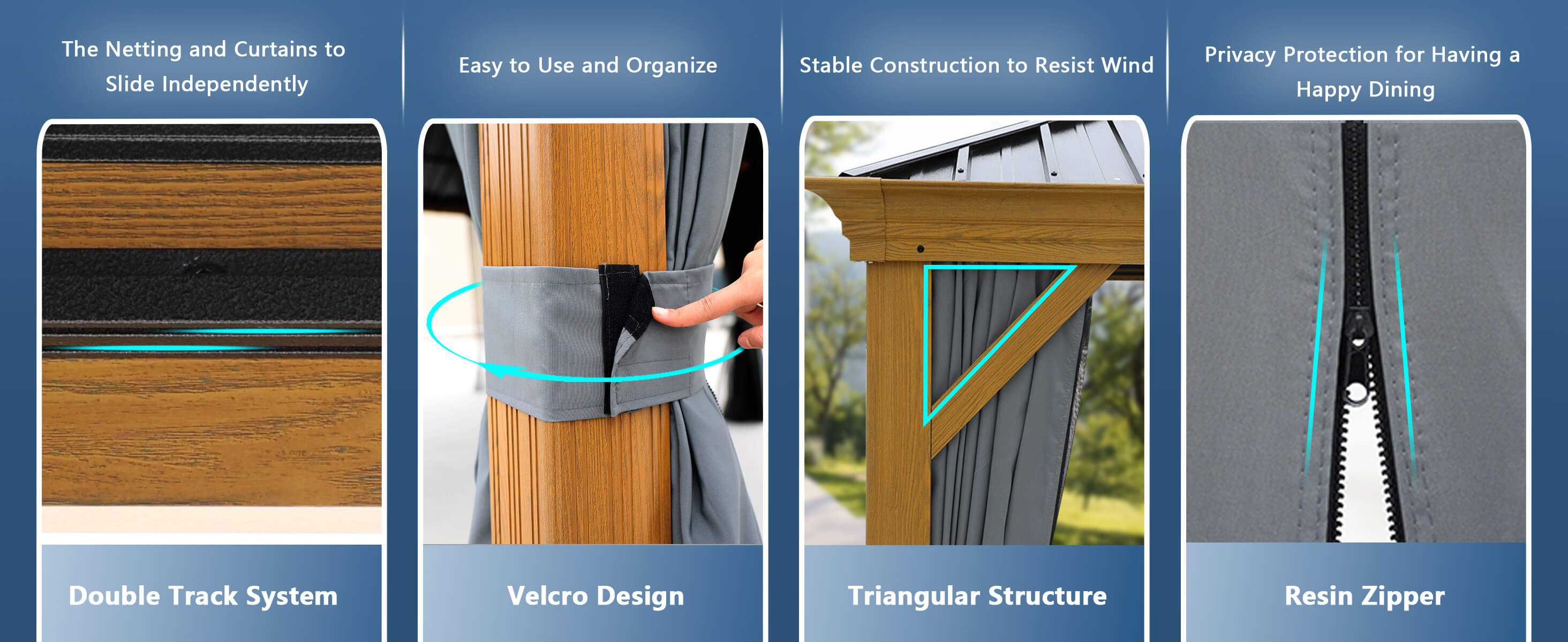 【PRIVACY PROTECTION】Fully enclosed zippered removable double-layer PBV-coated curtains and netting protect you from UV rays while adding more privacy. The hooks on the top roof can be used to hang up lights and fans in summer. Gazebo canopy has double track system to allow you to slide each layer easily.