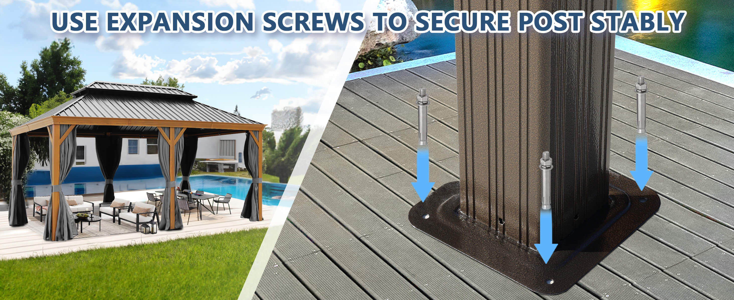 【RUSTPROOF ALUMINUM FRAME】Sturdy permanent patio gazebo built with 4.8"x4.8" triangular powder-coated aluminum frame is more stable & durable than standard models. The pergola gazebo with pre-drilled bases is designed for all kinds of uneven ground and can be installed in different outdoor situation. All material are built to last, rustproof & weather-resistant.