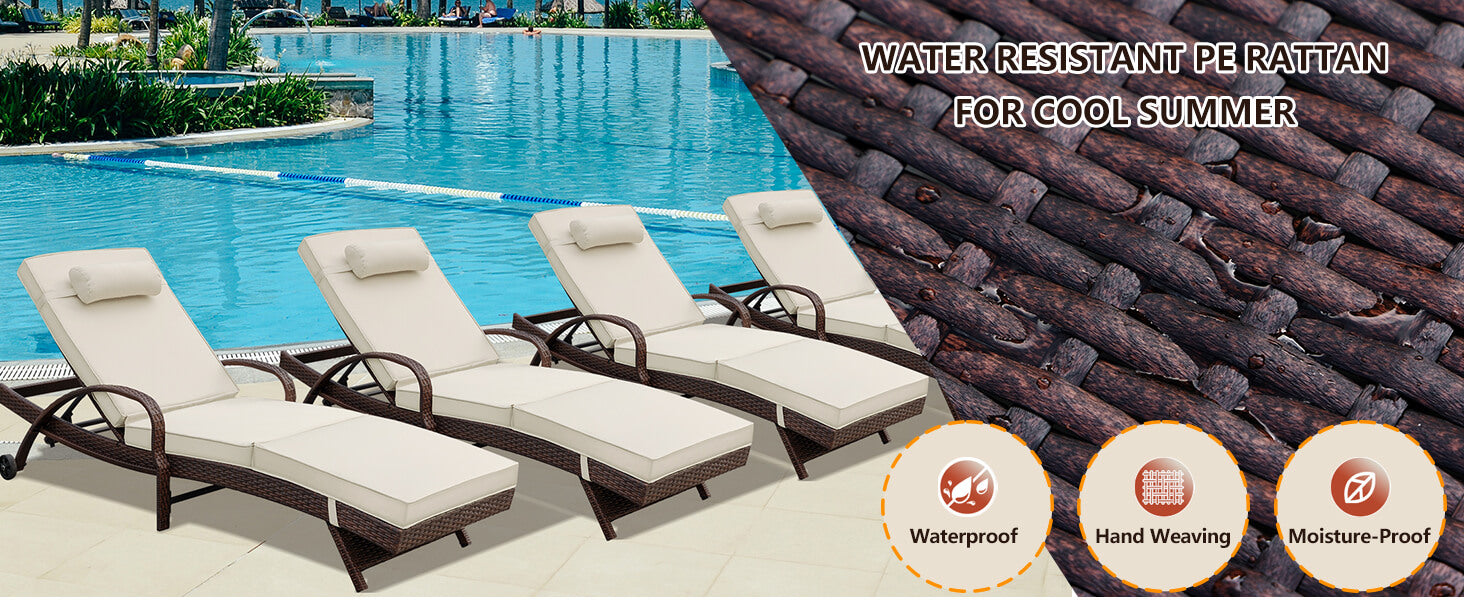 【High-Quality Rattan】Made of premium rattan, the beach chaise lounge chair is durable, anti-rust, waterproof and lightweight. Rattan brings you cool feeling in summer, matching your swimming pool and yard. Waterproof & long-lasting rattan material enhances its lifetime.