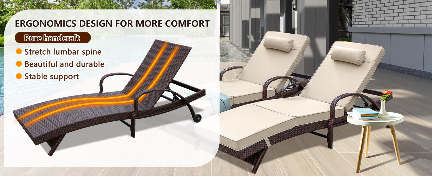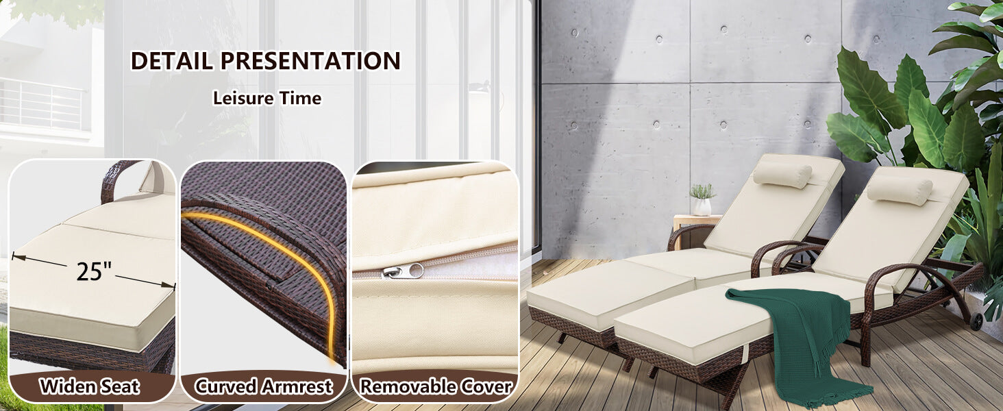 【Padded & Non-Slip Cushion】Patio wicker loungers chaise is padded with 3.1” thick cushion. Cushions can be tied on the lounge chairs to avoid the slip problems. The cushion covers are removable and washable.