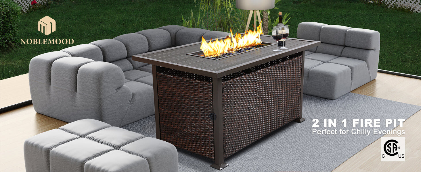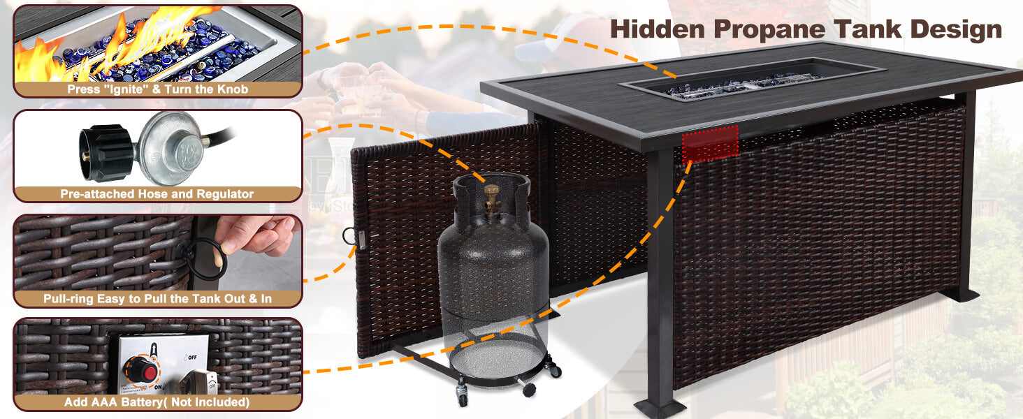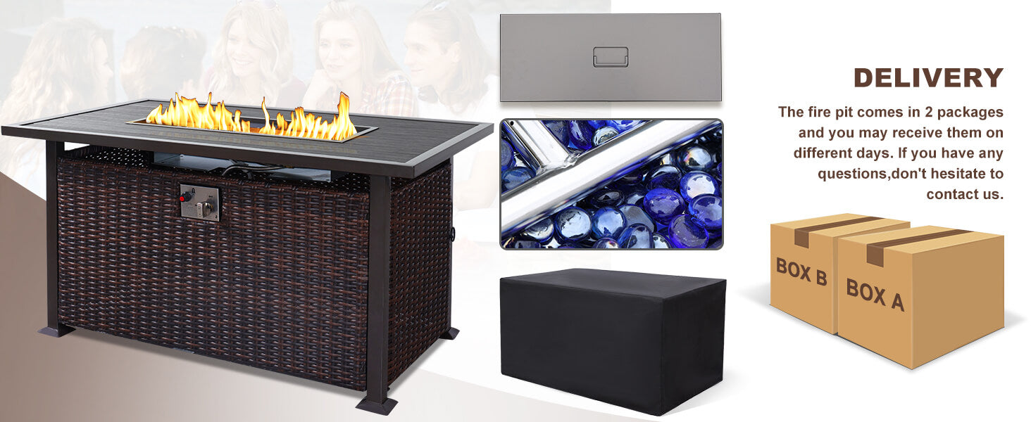 Elegant & High Quality-PE rattan is a weather-resistant material, brings impressive strength and durability. Made of powder-coated steel, the frame of the gas fire pit table is sturdy, resist rust and heat-resistant. Beautiful and elegant for your patio & backyard.