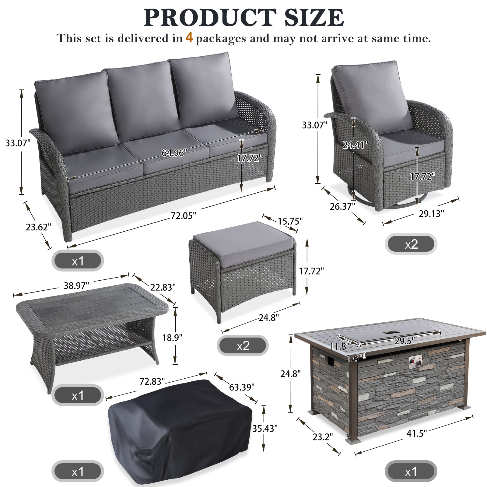 Package includes: 1x3-seater sofa, 2xswivel rocking chair, 2xottoman, 1xcoffee table, 1x Furniture Cover. 1 x Fire pit table with lid, 1 x cover, 1 x 9.92lbs glass beads