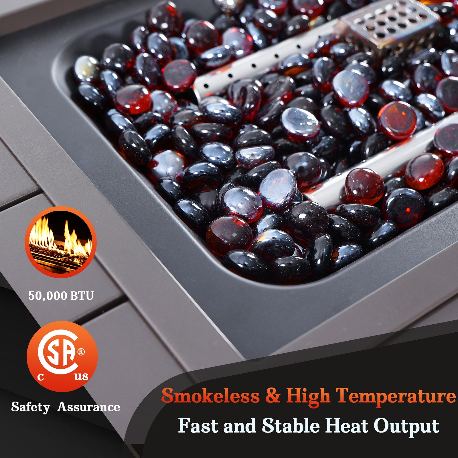 Using propane gas to support stable and clean burning, gas fire pit table provides smokeless & ashless BBQ experience. 50000 BTU heat output provides ample warmth, creating warm & romantic bonfire atmosphere in winter.