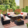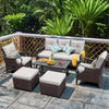 The patio furniture set with a fire pit table includes 7 pieces sectional sofa set with a coffee table and cushions, pillows, a 48-inch gas propane fire pit table with a waterproof cover, 10lbs blue glass beads, and a lid.