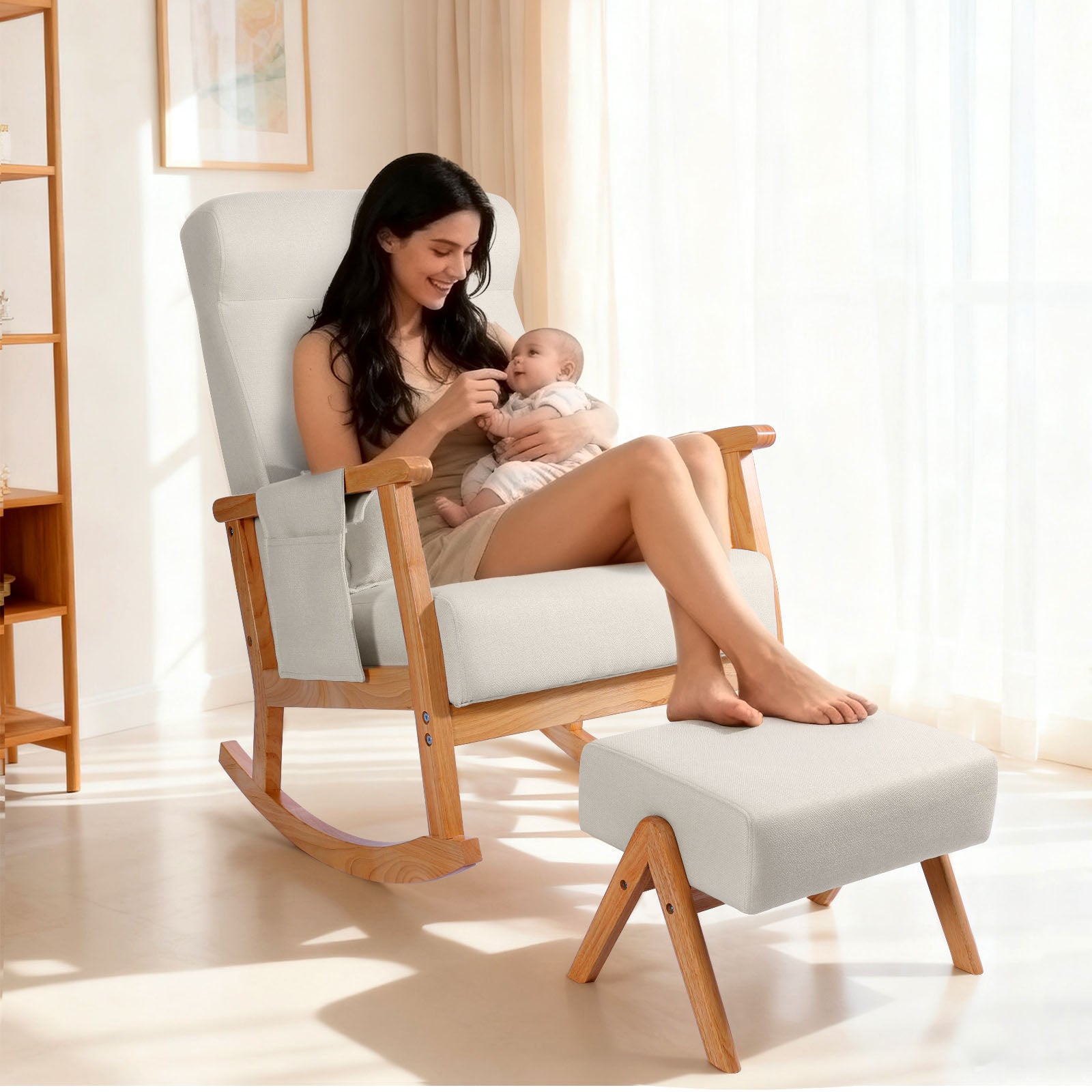 【Detachable Storage Bag】The storage bag on high back rocking chair is designed with a velcro design, which is a storage savior for small objects, such as mobile phones, magazine, eyeglasses etc. Especially for storing baby supplies when the mother coax the baby to sleep.
